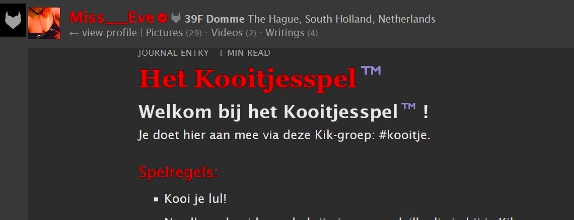 Geïnteresseerden in het VernederDiner™️ kunnen mij bereiken via dit mailadres [evefindom@yahoo.com – red.], op KiK via EveAMSDH of via Whatsapp (nooit bellen) op 06 576 238 19.