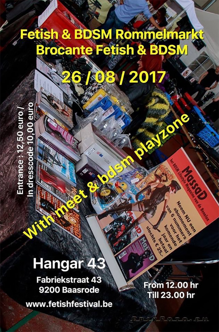 Bij onze vrienden van de Massad zagen wij op Twitter dat er vandaag een Fetish & BDSM rommelmarkt is op het Fetish Festival (Helaas is de site niet geüpdatet lijkt het) in Baasrode (Hangar 43). Het festival begint om 12:00 dus als je nu in de auto stapt ben je op zeker op tijd! Voor slechts 12,50 heb je een spannende zonnige zaterdag. Veel plezier en de groetjes van ons!