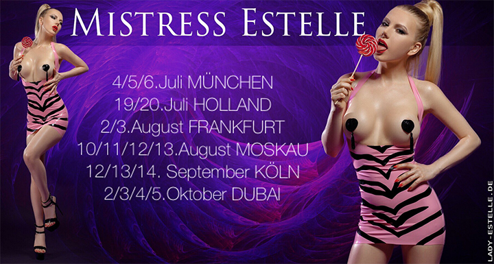 Op de redactie werden wij door Lady Estelle geattendeerd op haar volgende bezoek aan Nederland. Deze Russische schoonheid is in juli weer te boeken voor een sessie in ons kikkerlandje. Pak deze unieke kans slaaf en dien haar voor ze weer vertrekt naar haar volgende bestemming. Contact met Lady Estelle kan via hier.