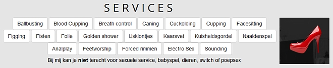 Wij gaan natuurlijk de komende tijd wel wat meer aandacht besteden aan deze Meesteres die eerst een tijd onder de radar actief was, maar nu ineens schittert als al de andere Sterren. Bij ‘services‘ op haar overigens schitterende website krijg je een idee wat ze jou biedt én vraagt…