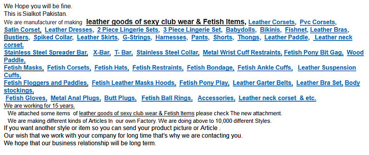 Kennelijk is het een atelier dat geile BDSM-pakjes en -attributen maakt. Die Pakistani denken waarschijnlijk dat wij een webshop zijn en dat wij hun spullen kunnen verkopen.